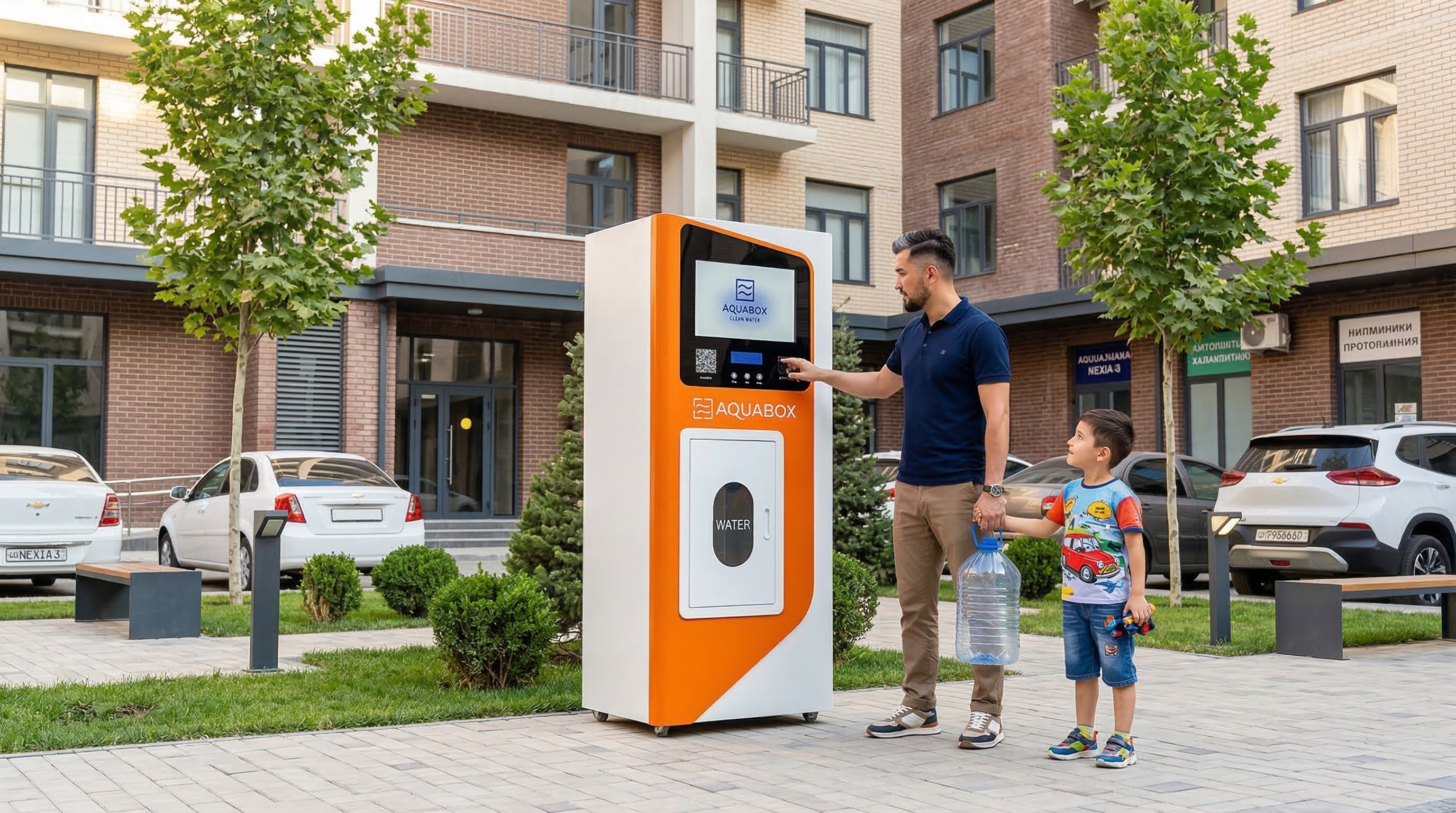 Aquabox — аппарат по розливу воды с встроенным LED-экраном. Человек стоит перед ним 40-50 секунд и полностью погружён в ваш контент.